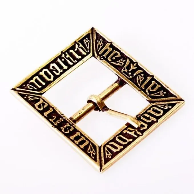 Diese Schnalle ist eine Nachbildung eines Originals von 1450. Es wurde von König Erik von Pommern getragen wurde. Schnallen wie diese wurden zwischen der 2. Hälfte des 15. und der ersten Hälfte des 16. Jahrhunderts getragen. Die Schnalle hat den Text: Hilfe ghot un maria nu Altit“(Gott und Maria sind für immer unsere Helfer).
