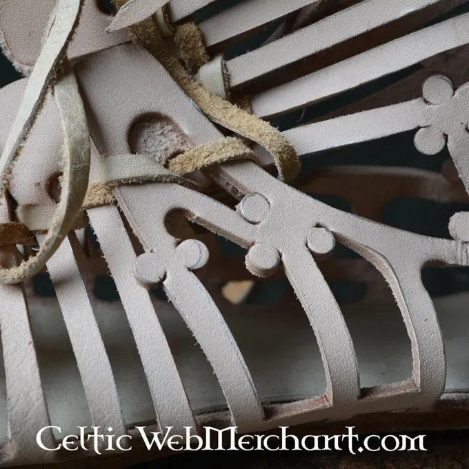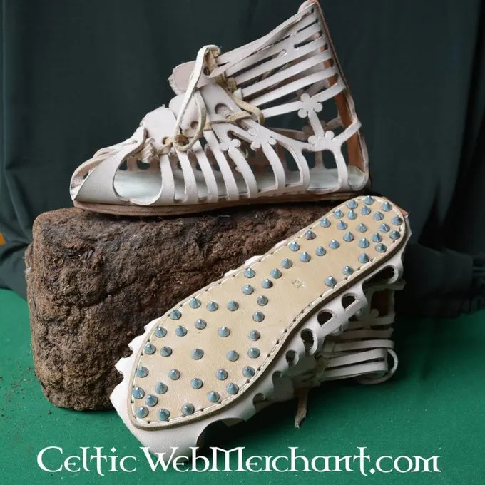 Diese caligae sind aus 2 mm dicken braunen Leder. Die Ledersohlen sind mit Nägeln für einen zusätzlichen Halt und Festigkeit geschlagen. Die caligae sind in den Größen 40,5; 42; 43; 44,5 und 46