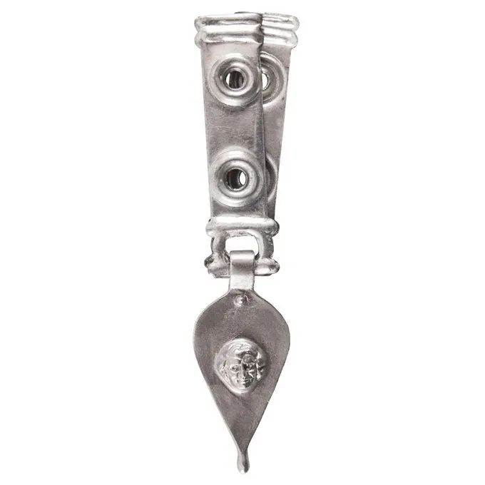 Der wunderschön eingerichtete Bandende ist perfekt, wenn Sie Ihren eigenen Roman Gürtel oder als Ersatzteil zu machen. Dieser Gürtel Beschlag auf einem Original aus der 2. Hälfte des 1. Jahrhunderts basiert. und wurde in Serbien, in der Nähe von Tekija gefunden, den Teil der römischen Provinz Pannonia war. Ursprünglich wurde es am Ende 1 der vertikal hängenden Leder Gurtbänder auf dem Cingulum eines römischen Legionärs montiert. Die Riemenarmatur ist aus Messing mit einer Schicht aus Zinn, so dass es aussieht wie es aus Silber hergestellt ist. Es hat vorgebohrte Löcher für die an einem Gurtbandes Befestigung.
