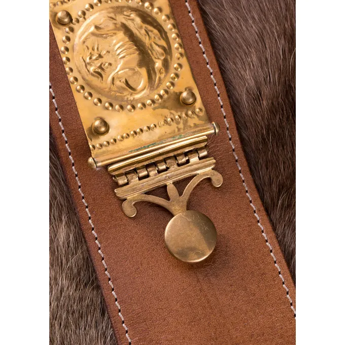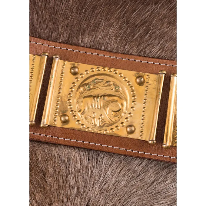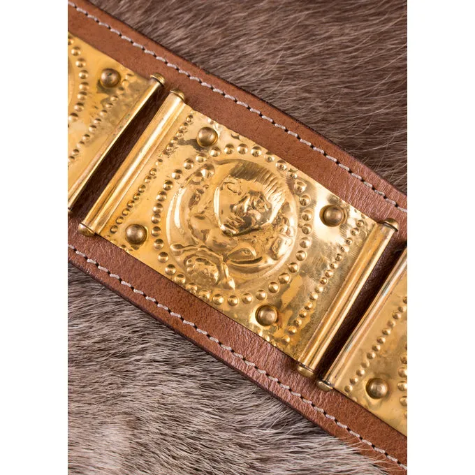 Das Cingulum ist ein Roman Gürtel von Legionären in der römischen Armee getragen. Der Gürtel die Hose oder Braccae gehalten, aber mit seinen schönen Dekorationen, es war auch ein Symbol für militärische Leistung und hohen Rang. Die Schürze, bestehend aus 4 Lederbänder, hat Messing Pteryges und endet mit einem pensilia. Die quadratischen Platten auf dem Band zeigen, abwechselnd ein menschliches Gesicht und die Wolf, die Zwillinge und Remus Romus Fütterung. In der römischen Mythologie, das sind die Gründer der Stadt Rom, eine passende Dekoration für jemanden von hohem Rang, die in die Fußstapfen dieser Helden folgen wollte. Dieser Gürtel hat auch eine Schnalle und eine pugio Suspension.