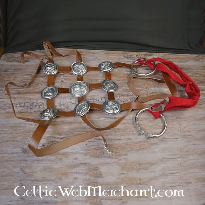 Dieses Komplettset von Phaleren auf mehreren Vorlagen basieren. Phaleren waren ‚Medaillen‘, die die centurio für herausragende Leistungen verdient. Diese Phaleren wurden um den Körper von der Zenturio getragen. Ursprünglich diese Trophäen, ein Gesicht darstellt, wurden von den Kelten. Celtic Krieger enthauptet ihre Feinde und brachten die Köpfe als Trophäen.