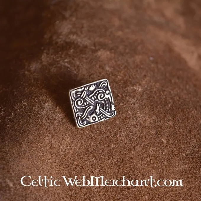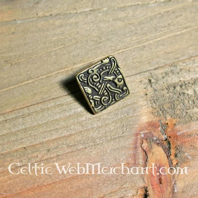 Dieses Gürtelbeschlag ist eine Replik eines 9. bis 10. Jahrhundert Original. Es kann für die Dekoration Lederwaren wie Gürtel und Taschen verwendet werden. Dieser Gürtelbeschlag misst 1,8 x 1,7 cm und ist daher bestens geeignet für einen Gurtband mit einer Breite von 2 cm. Es ist bronzefarben.