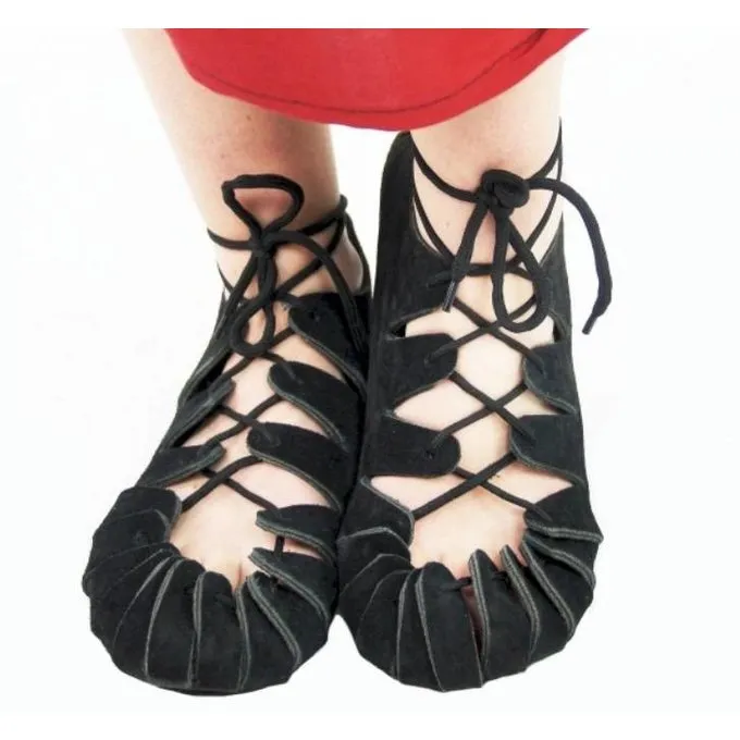 Details: Material: Oberfläche = Rindswildleder 4 mm dick, Sohle = 5 mm Gummi / Historischer Zeitraum: Eisenzeit – Mittelalter / Größen: 30 bis 35 (siehe Drop-Down-Menü) / Farbe: schwarz / Auf der Grundlage eines historischen Originals : Ja