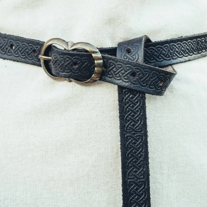 Ein idealer Gürtel für Kleider und Tuniken, das eine bessere Passform für historische Kleidung bietet. Es ist wunderschön mit einem keltischen Knotenmotiv dekoriert. Der Gürtel hat eine mittelalterliche bronzefarbene Schnalle.