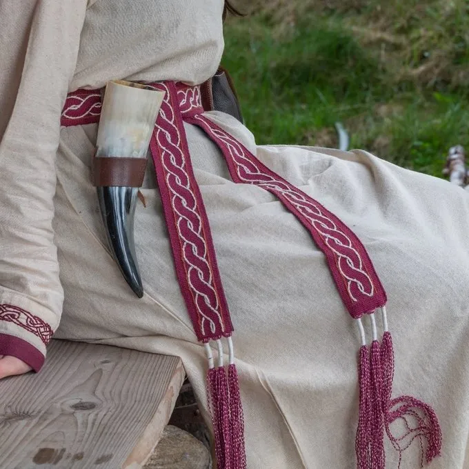 Dieser textile Wikingergürtel passt gut zu jedem Outfit von Wikinger und Frauen. Der Gürtel hat Stickerei in Form eines Knotenmotivs. Dieser luxuriöse Gürtel ist auch geeignet, um Taschen und Accessoires aufzuhängen.